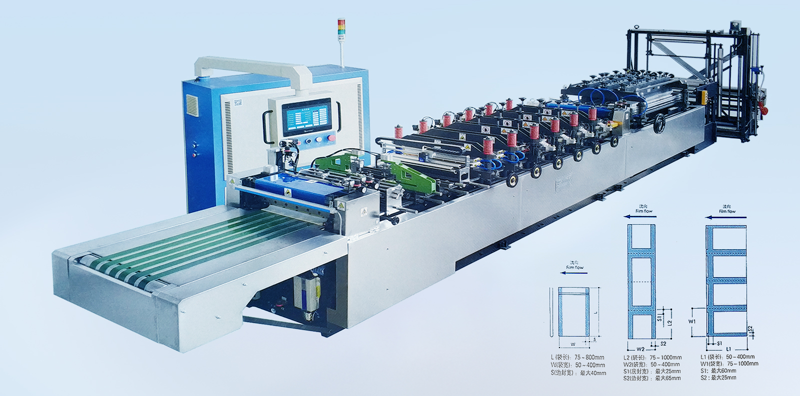 材料:各種復(fù)合薄膜。 卷筒:寬度≤1200mm,直徑≤800mm。 制袋速度:180段/分(機械設(shè)計速度)約<40m/min。 制袋寬度:≤500mm。 制袋長度:50-400mm,制袋長度超過400mm 以上應(yīng)采用倍送功能。